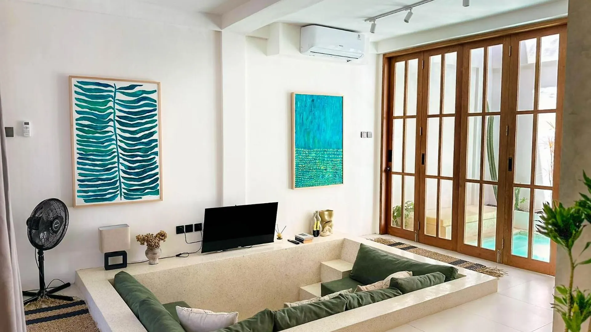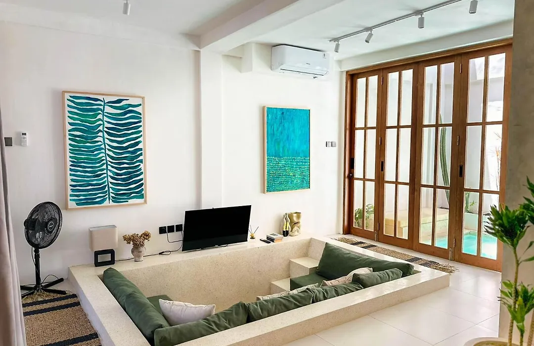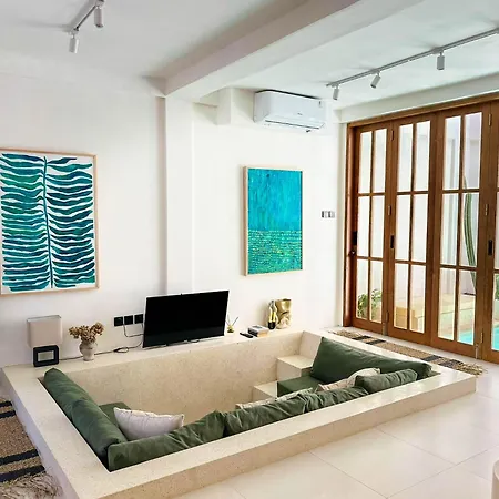 Ceria House Canggu设有3间卧室,私人游泳池以及水池景的露台。 该别墅距离Petitenget Beach海滩大约3.8公里,交通便利,距离Odyssey Mvmt仅有450米。